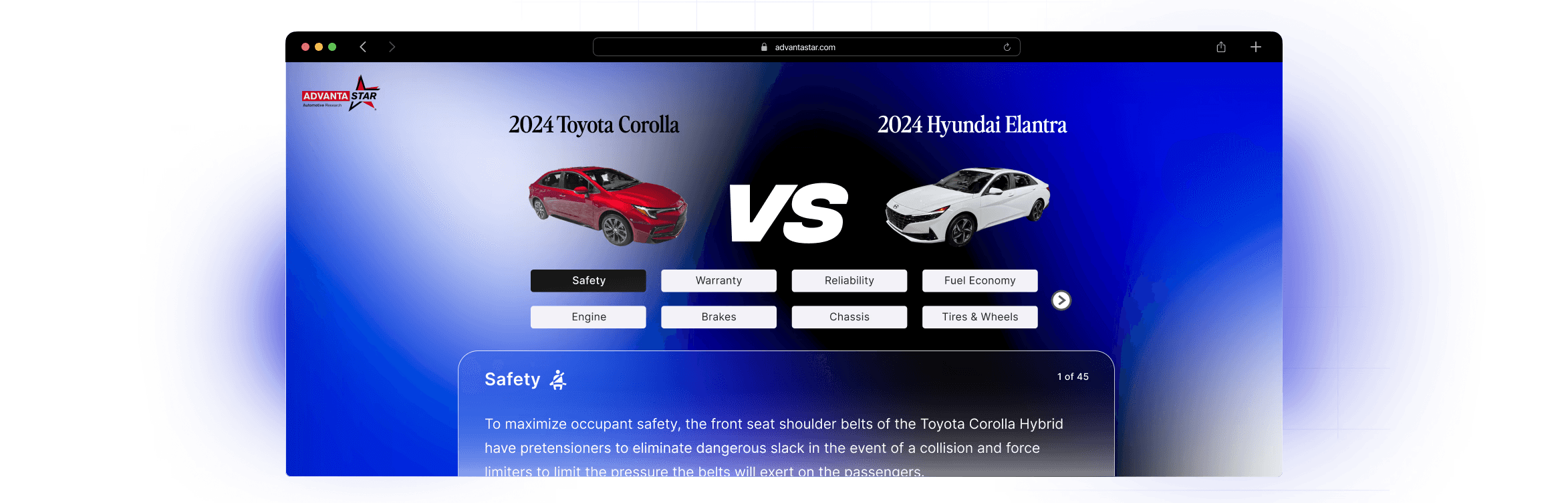 Advanta-STAR web links put our unique Competitive Comparison and Advanced Research reports in front of prospects searching for information about your vehicles, engaging them with detailed, relevant content that keeps them on your site.